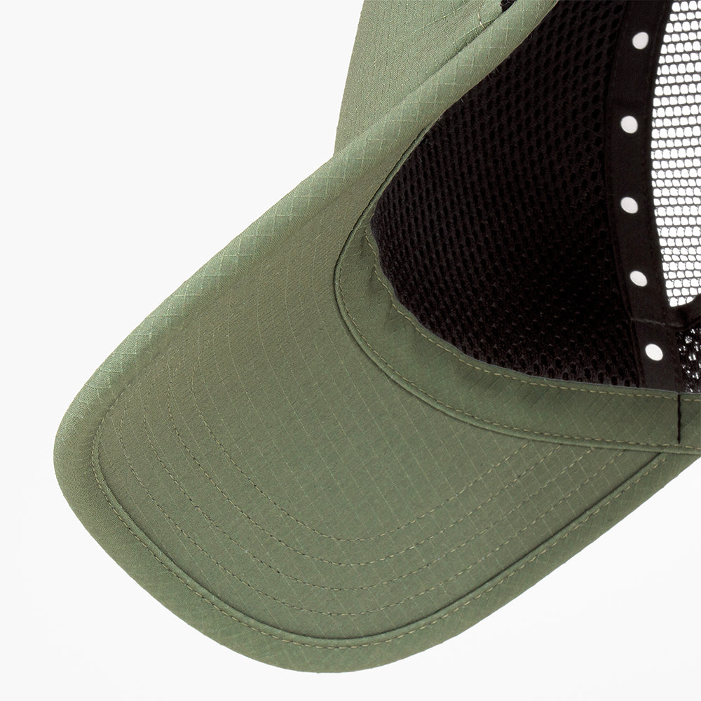 the SOFTcurve brim and front panel are wrapped in durable ROCstop™ ripstop with a +50 UPF rating for sun protection. inside, a light weight liner and integrated headband feature COOLmatic | PLUS 3Dmesh™, providing structure, ventilation, and anti-odor performance. at the back, MACKmesh™, a recycled take on classic trucker mesh, enhances breathability.